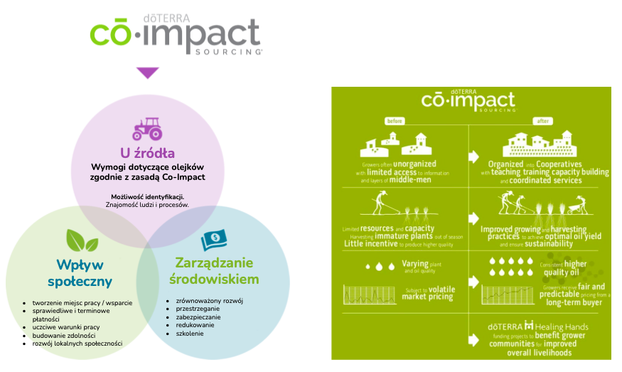 „Kiedy doTERRA szuka partnerstwa w zakresie pozyskiwania surowców, celowo wybieramy lokalizacje, w których możemy poprawić dobrostan ludzi, warunki społeczne, ekonomiczne i środowiskowe, jednocześnie produkując olejki eteryczne najwyższej jakości. Ponieważ wiele z naszych roślin najlepiej rośnie w krajach rozwijających się, dōTERRA ma wyjątkową możliwość tworzenia i wspierania etycznych łańcuchów dostaw, które przynoszą korzyści potrzebującym społecznościom wiejskim. Często doświadczeni hodowcy roślin olejkodajnych, zbieracze, hodowcy i destylatorzy na obszarach słabo rozwiniętych otrzymują nieuczciwe wynagrodzenie lub są wykorzystywani, co ogranicza ich możliwości ochrony przed ubóstwem. Co-Impact Sourcing zapewnia narzędzia potrzebne do ochrony tych rodzin i społeczności przed ubóstwem oraz promowania rozwoju gospodarczego. doTERRA przestrzega dodatkowych wytycznych dotyczących zaopatrzenia podczas pracy w krajach rozwijających się ”.