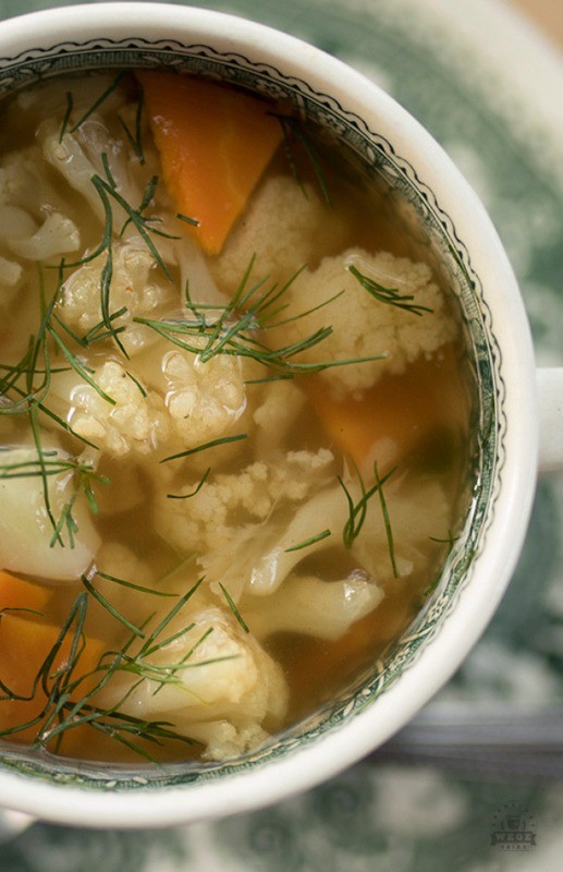 Kalafiora obierz z liści, umyj, podziel na różyczki. Marchew i pietruszkę obierz, pokrój w drobną kostkę. Wrzuć warzywa do garnka, zalej wodą ponad ich poziom, dodaj liścia i ziele oraz szczyptę soli. Gotuj do miękkości warzyw. Pod koniec gotowania dodaj posiekany koperek. Przypraw solą, pieprzem oraz szczyptą papryki wędzonej do smaku.